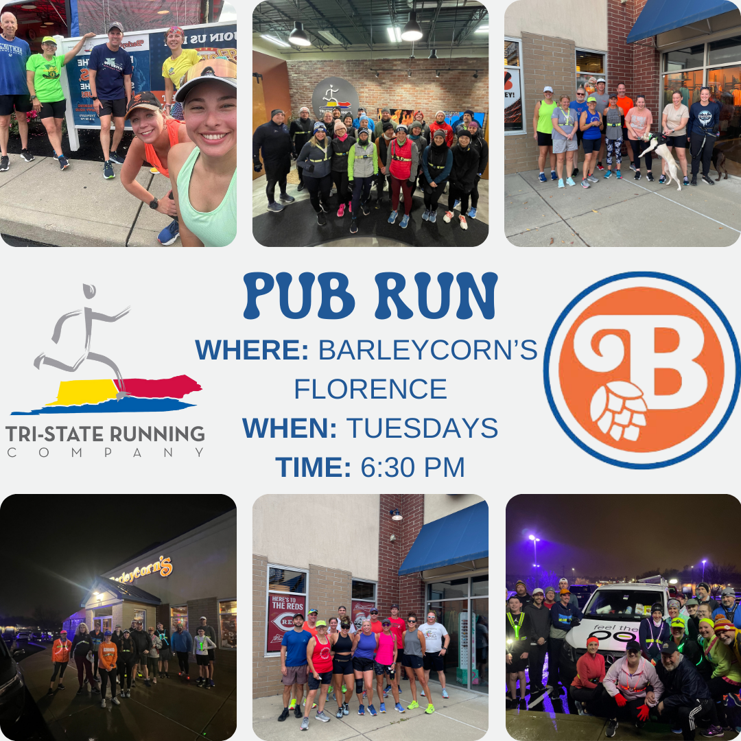 Meet us Tuesday nights at 6:30 pm for our fun pub run from Barleycorn’s Florence. Routes will include 3-5 miles options and are free, and open to the public. All paces and abilities are welcome! Run for the wings, stay for the Happy Hour!