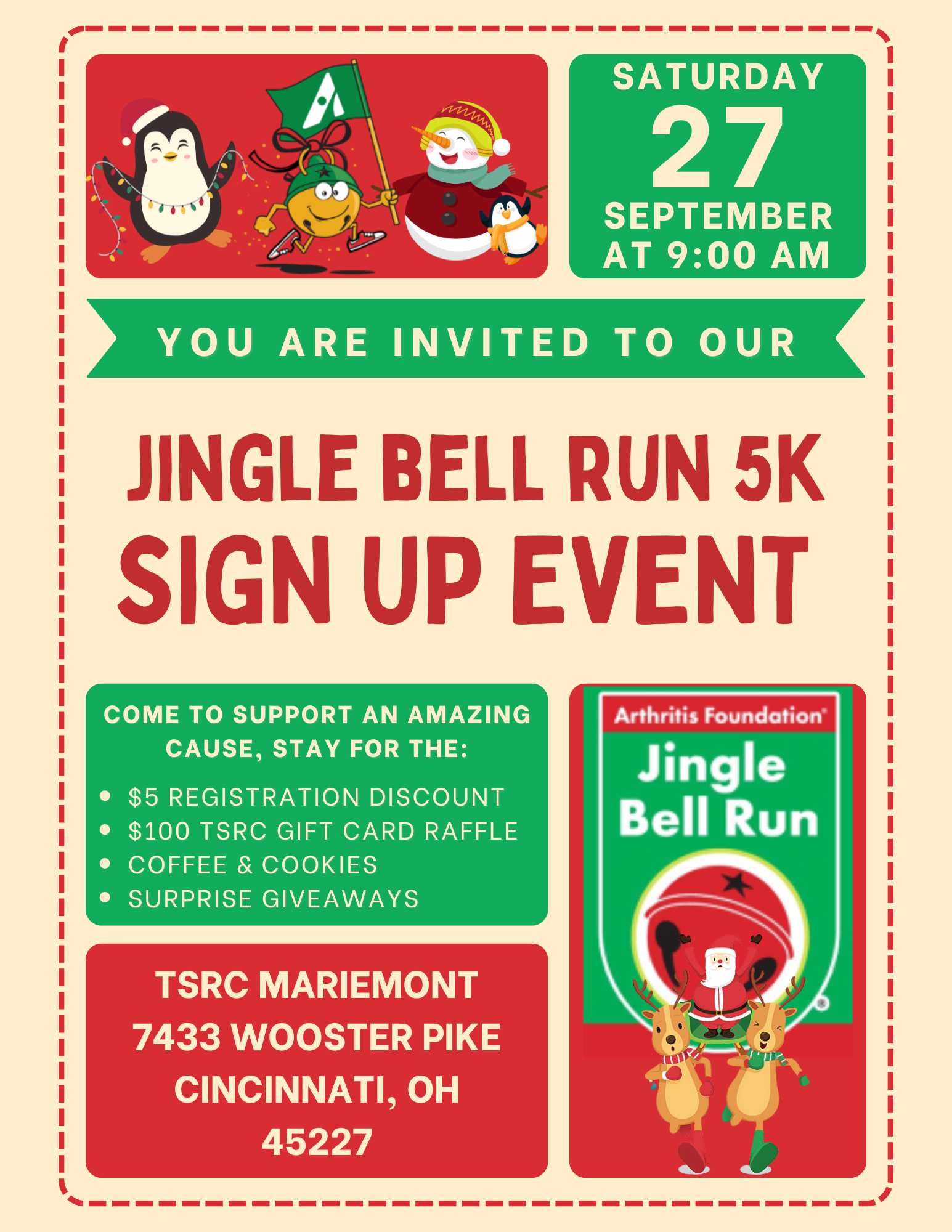Tri-State Running Company Mariemont 7433 Wooster Pike, cincinnati, OH, United StatesGet a Jumpstart on the Jingle Bell Run 5K! Get a head start on the holiday spirit and join us at our Mariemont location on Saturday, September 27, from 9 AM to 1 PM for our annual Jingle Bell Run 5K Sign-Up Event! Come out to support a great cause and enjoy some festive […]